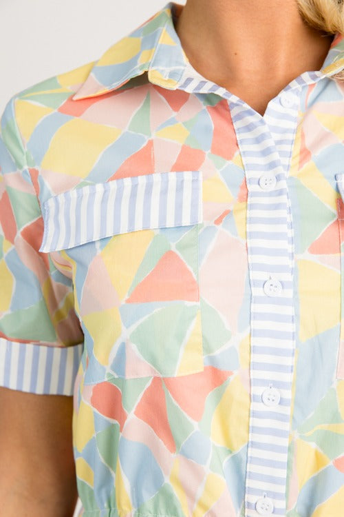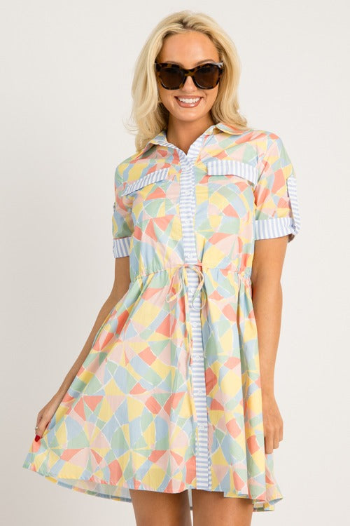 Make a playful statement in this vibrant dress, showcasing an eye-catching abstract print with crisp blue and white stripe trim accents. The shirt dress silhouette includes timeless details like a classic collar and a functional button front. Designed for a flattering fit, it features an adjustable draw waist tie to cinch your silhouette.